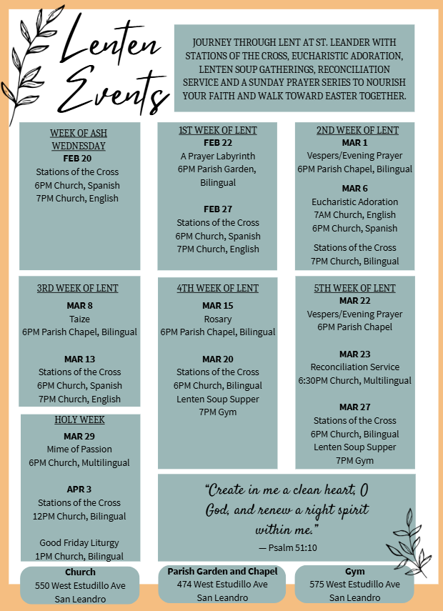 Lent is a time to slow down, pray more deeply, and walk together as a parish community. We invite you to take part in our Lenten events at St. Leander, with opportunities for prayer, reflection, and fellowship throughout the season.
