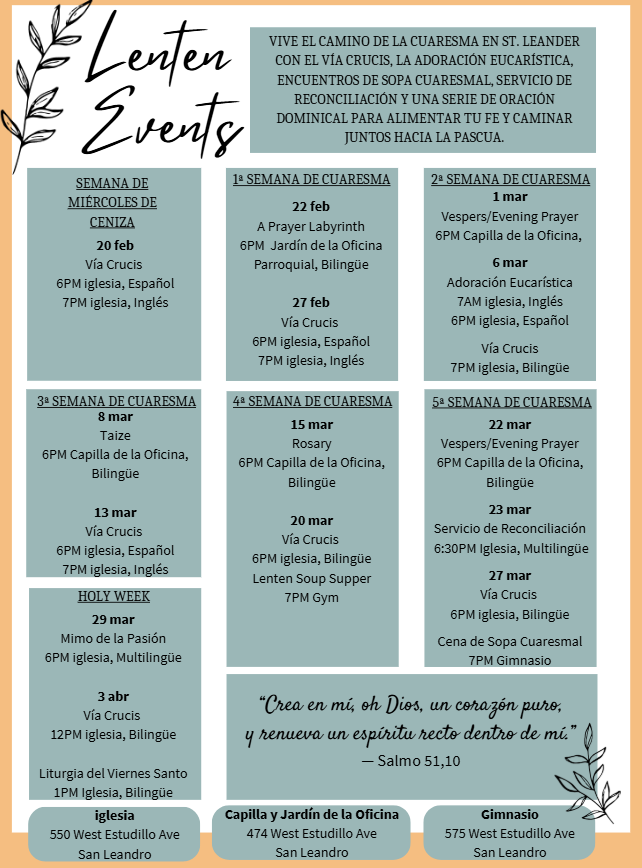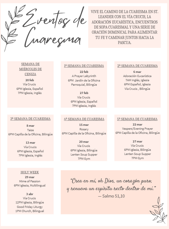 La Cuaresma es un tiempo para detenernos, orar más profundamente y caminar juntos como comunidad parroquial. Te invitamos a participar en nuestros eventos cuaresmales en St. Leander, con oportunidades de oración, reflexión y convivencia durante toda la temporada.